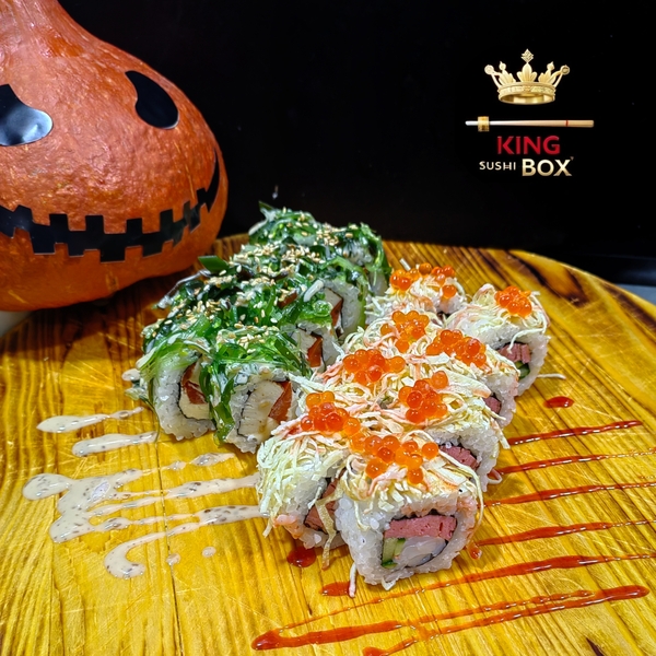 Состав: рис, нори, сыр сливочно-творожный, креветка, лосось, чука, томат, омлет, крабовая палка, соус унаги, спайси соус, соус ананасовый с чили, орехово-кунжутный соус, кунжут.
