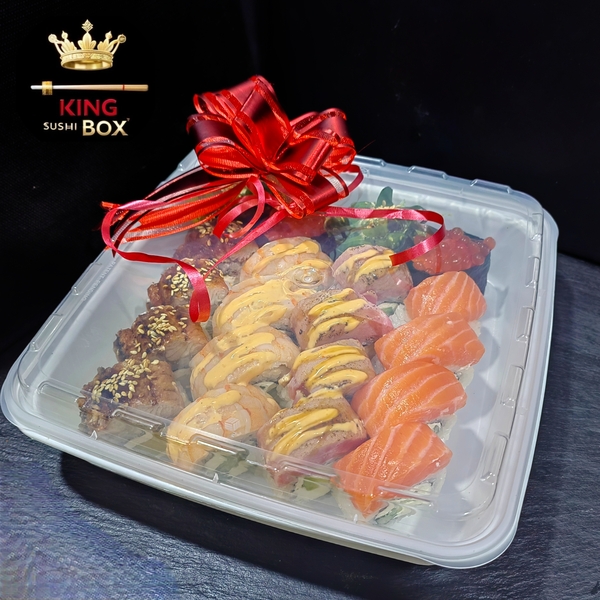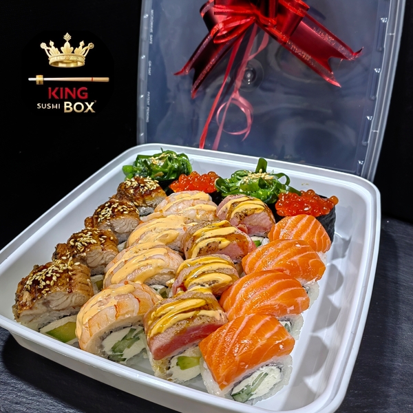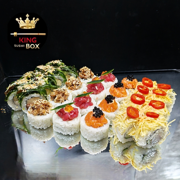 Состав: рис, нори, сыр сливочно-творожный, омлет, огурец, томат, лосось, тунец, угорь, креветка, чука, чакин, икра красная, икра черная имитация, перец Чили маринованный, соус спайси, соус ореховый, соус унаги, кунжут жареный.